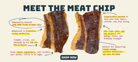Simple: every 5oz bag starts as more than a FULL POUND of prime brisket. We hand slice it, render it down, and transform it into a crunchy, protein-packed chip you can take with you anywhere. That means you’re basically holding a BBQ joint’s worth of brisket in snack form — without the sauce on your shirt.
